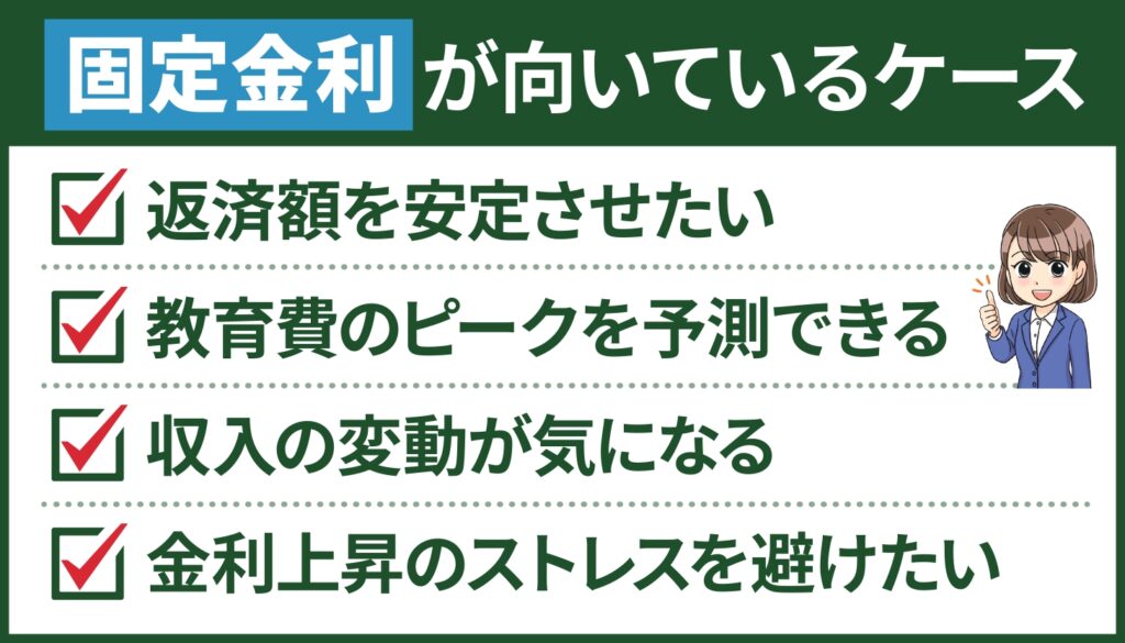 教育費が重なる時期など、家計の見通しを立てたい家庭では、固定金利の安定性が大きなメリットになります。