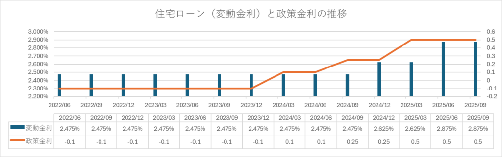 以下は主要銀行における住宅ローン金利(変動)と政策金利の推移をまとめたグラフです。