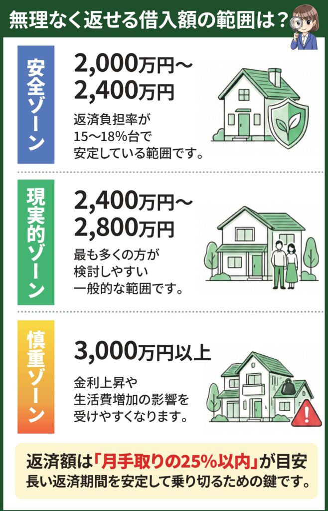 このように、「年収倍率の目安(5〜7倍)」と「返済負担率の目安(20〜25%以内)」を並べて考えると、無理なく返済できる借入額は自然と2,000万〜2,800万円に収まることがわかります。