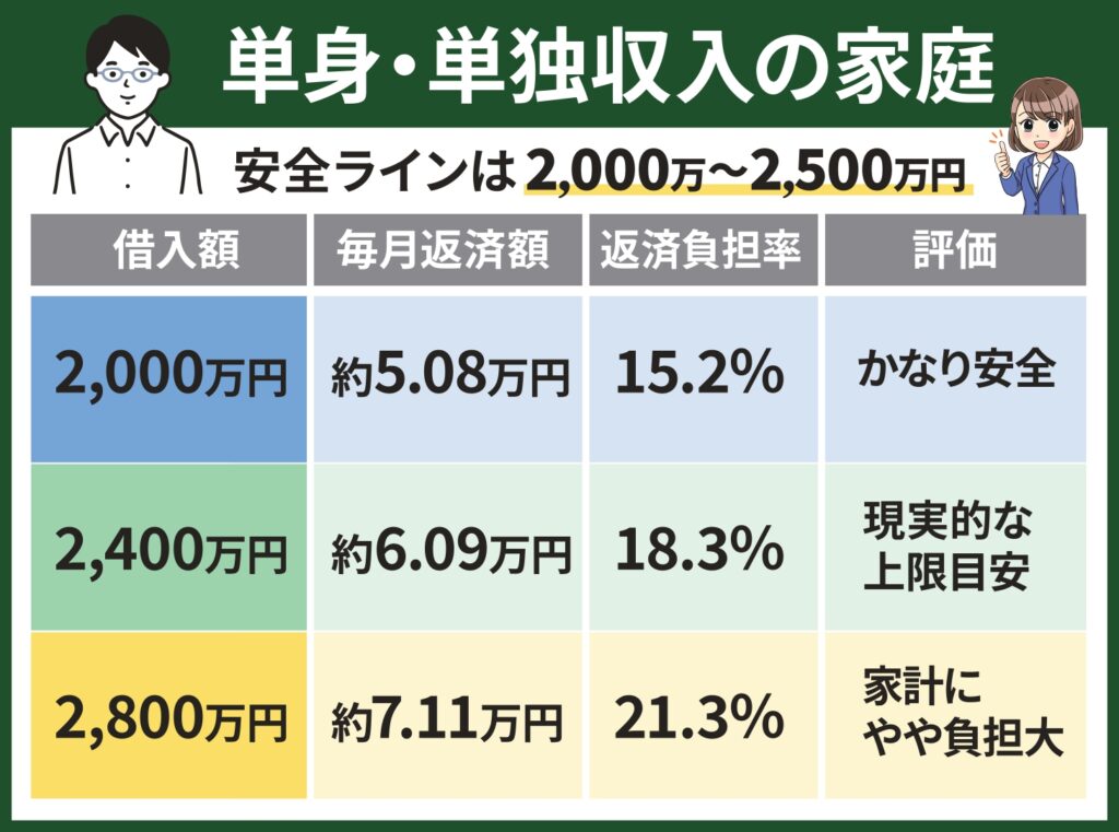 単身やワンオペ家計では慎重に検討すべきゾーンであり、頭金の投入や貯蓄計画とセットで考えることが重要です。