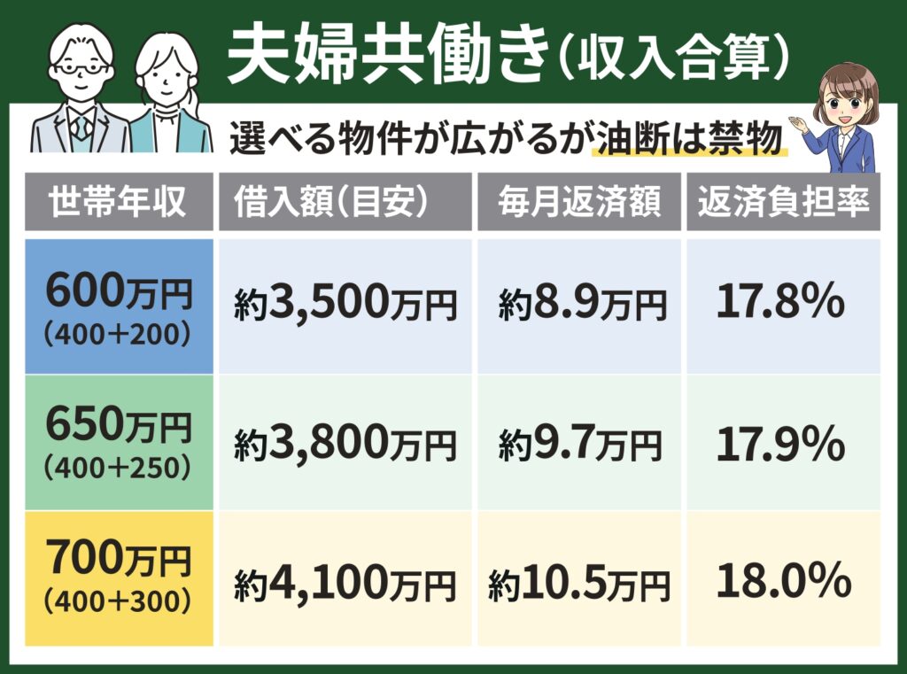 共働きで収入合算を行う場合、世帯年収が600〜700万円に届くケースもあり、借入可能額は大きく伸びます。