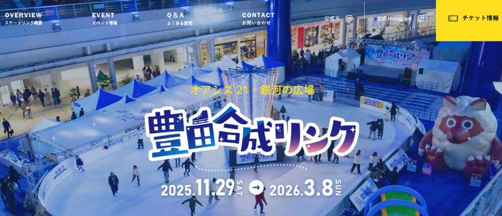 豊田合成リンクはオアシス21の「銀河の広場」に冬季限定で登場する“氷じゃない”スケートリンクです。