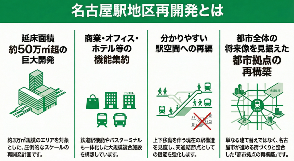 名古屋駅地区再開発は、名鉄名古屋駅一帯を中心に進められている大規模な再編計画です。