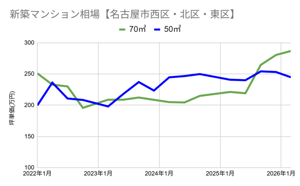 西区は70㎡クラスが前回比で小幅な上昇となった一方、50㎡クラスはやや下落しており、名古屋駅徒歩圏の物件では7,488万円と高額な新規掲載も見られるなど、立地によって価格水準の差が引き続き鮮明です。