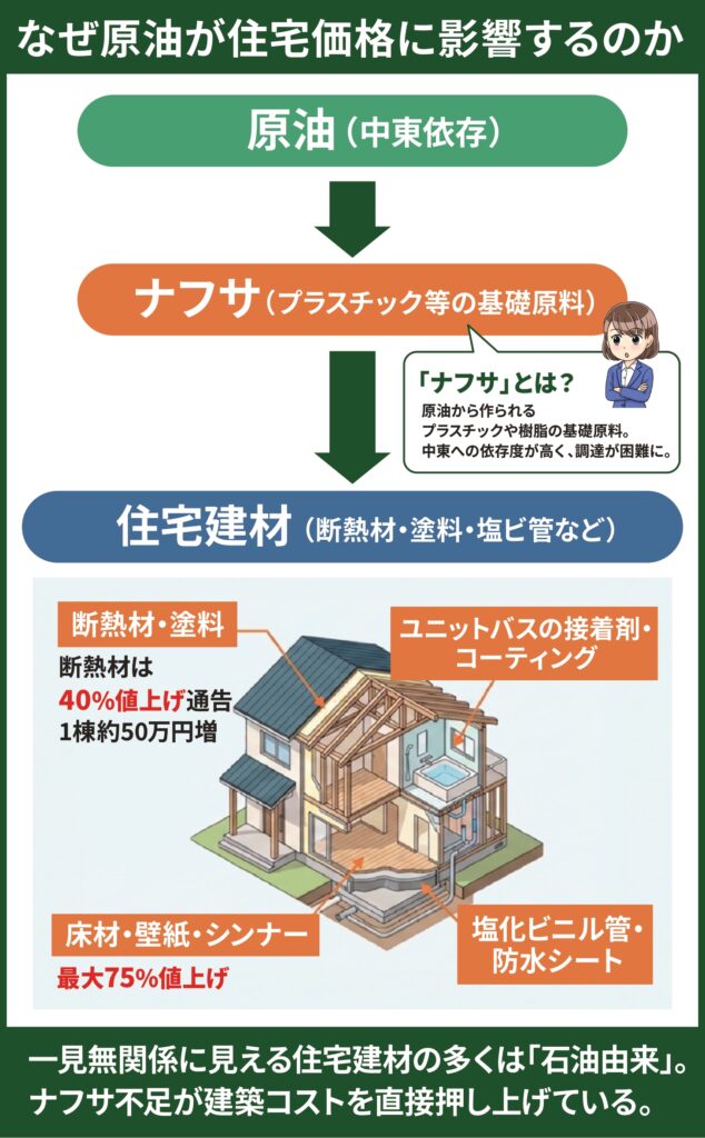 そこへナフサ不足による建材・設備の供給危機が重なり、新築住宅市場はさらなる縮小圧力にさらされています。