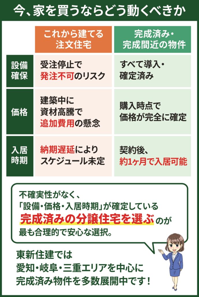 - 今後は「そもそも家を建てられない」というフェーズに移行する可能性があり、設備・価格・入居時期がすでに確定している完成済み物件を選ぶことが最も現実的な選択肢といえる