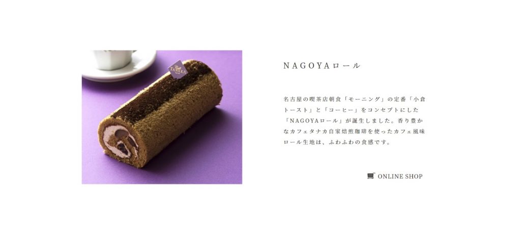 | おすすめポイント | 名古屋文化の1つ「モーニング」をコンセプトにしたロールケーキ。ふわふわ食感が人気のロール生地には、カフェエタナカの自家焙煎珈琲が使用されています。切り分けが必要なため、自宅用のおみやげにおすすめです。 |