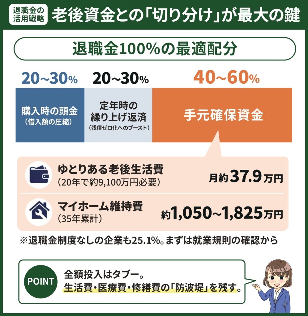 そのため退職金の一部を頭金や繰り上げ返済に活用しつつ、残りは老後の生活費・医療費・修繕費として手元に確保するという使い方がおすすめです。