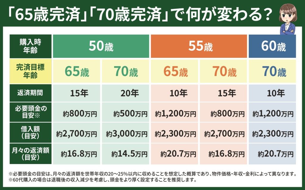 完済年齢の設定によって、月々の返済額と必要な頭金の水準は大きく変わります。