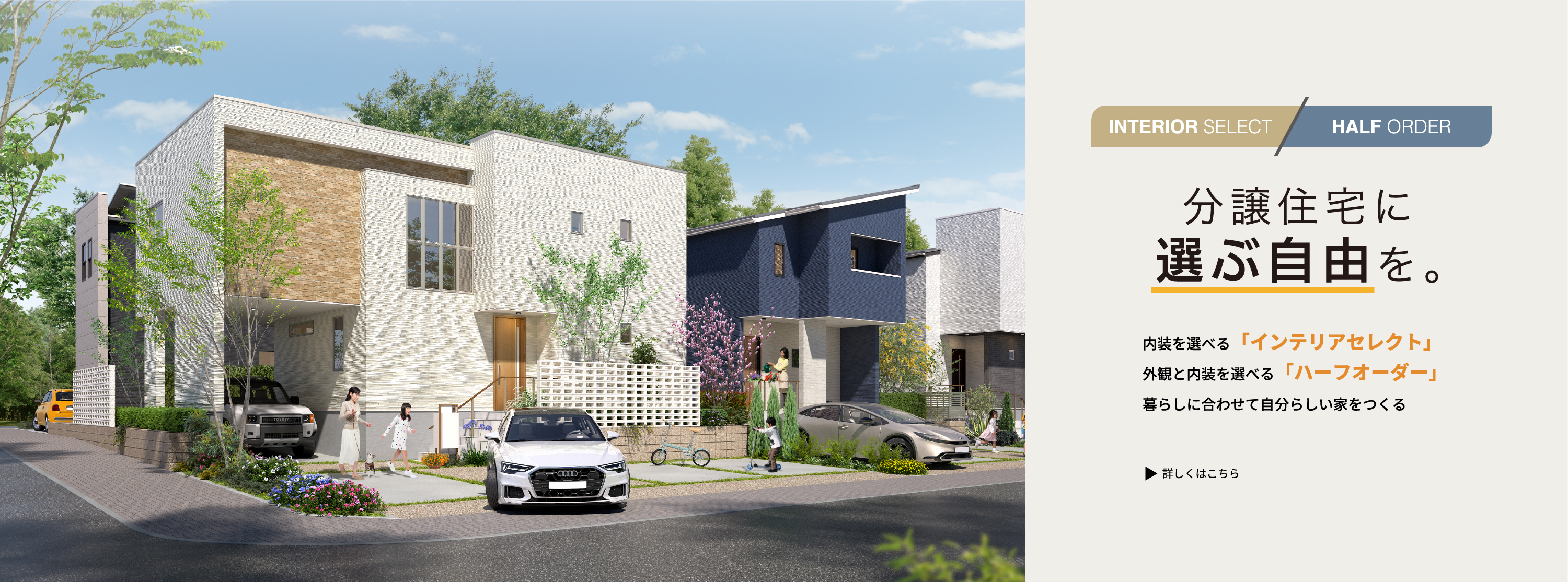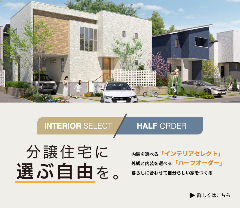 東新住建の分譲住宅では、内装や間取りが選べる「インテリアセレクト」、 さらに外観まで選べる「ハーフオーダー」で、まるで注文住宅のような仕上がりを実現。 建売の手軽さと、注文住宅のこだわりを兼ね備えた新しい選択肢で、“自分らしさ”を叶える家づくりがここにあります。