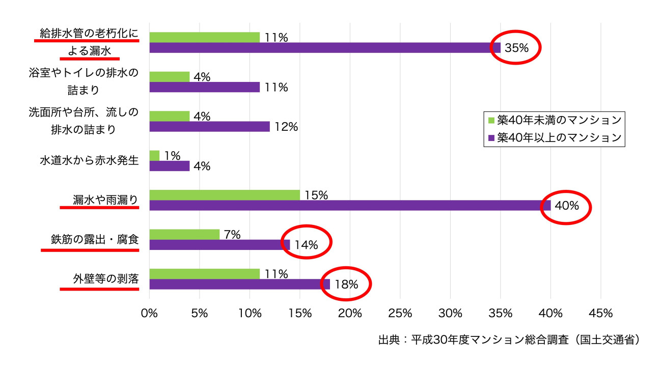 [13] => 築40年以上の高経年マンションでは、共有部分である外壁の剥落、鉄筋の露出・腐食、旧配管の老朽化といった、生命・身体や財産・資産価値に影響を抱える物件も多く存在します。