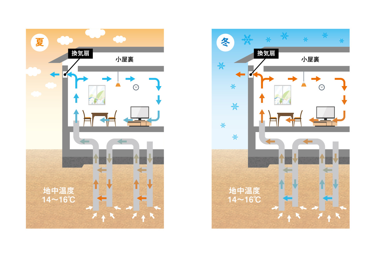 地中の温度は年間を通しておおむね14〜16℃程度で安定しているため、夏は外気より涼しく、冬は外気より暖かいという特徴があります。