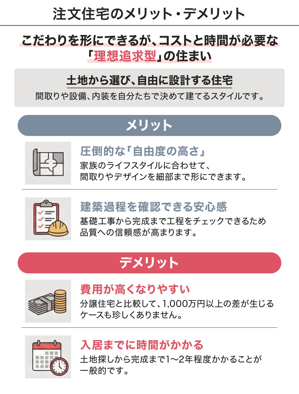 ・注文住宅は自由度が高い反面、費用が高く入居までに時間がかかる傾向にある
