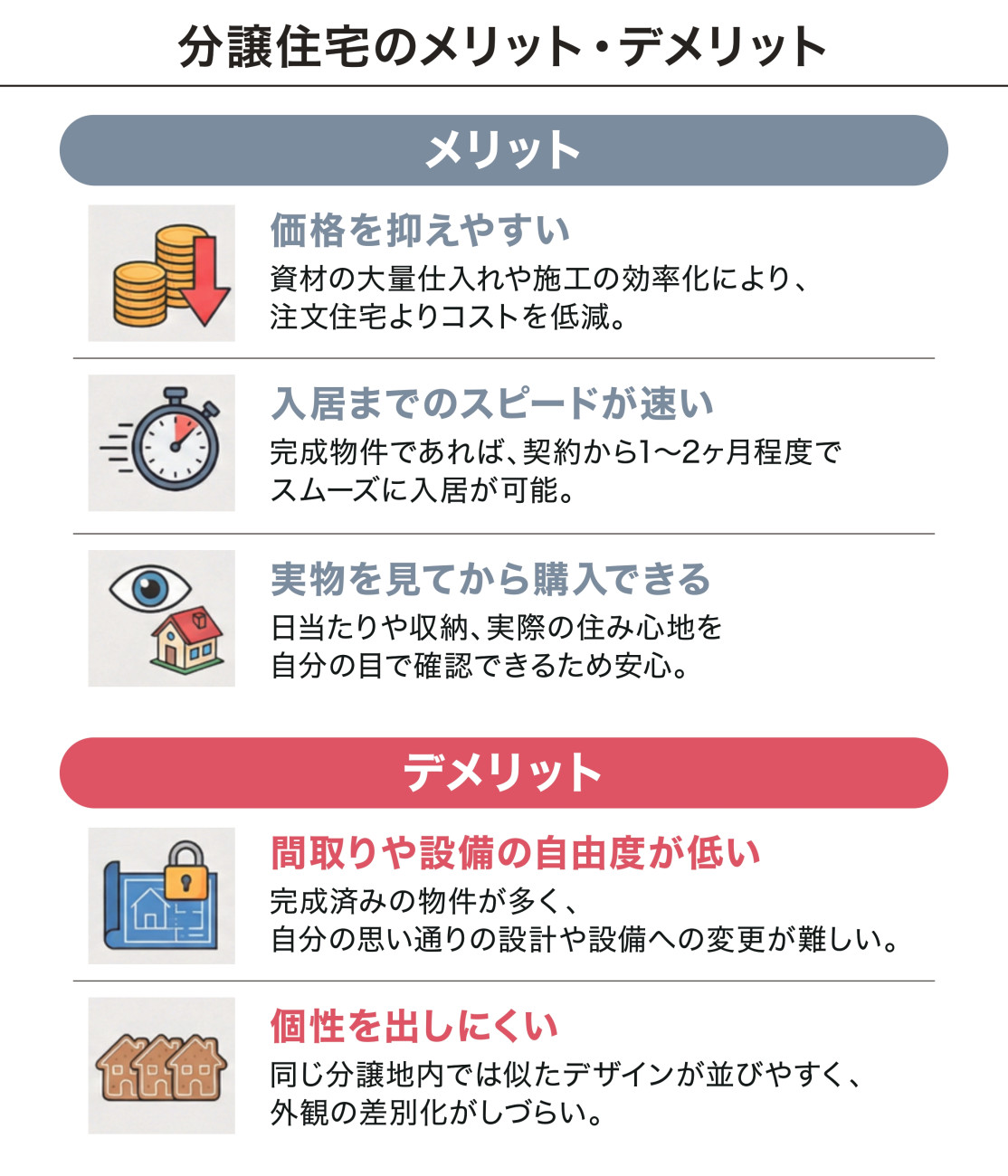・分譲住宅は価格を抑えやすくスピーディーに入居できる一方、間取りやデザインの選択肢に限りがある