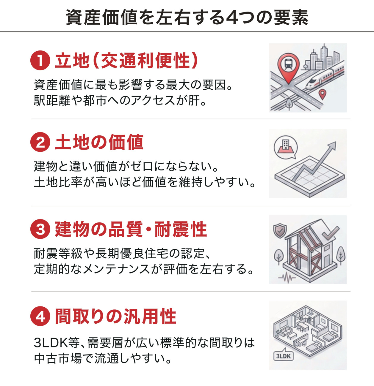 将来の売却・賃貸活用を見据えたとき、資産価値に直結する要素はある程度明確に整理することができます。