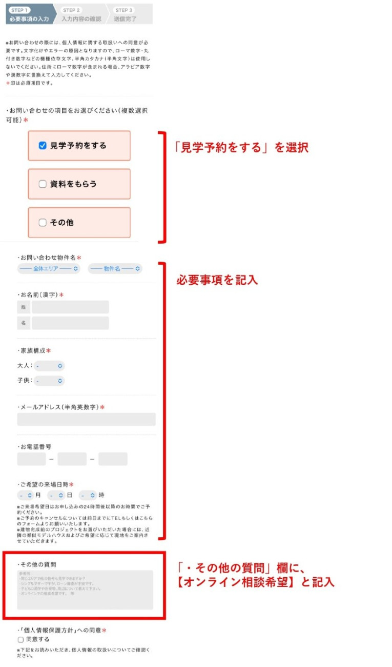 ②「見学予約をする」にチェックを入れた後、必須事項をご入力ください。