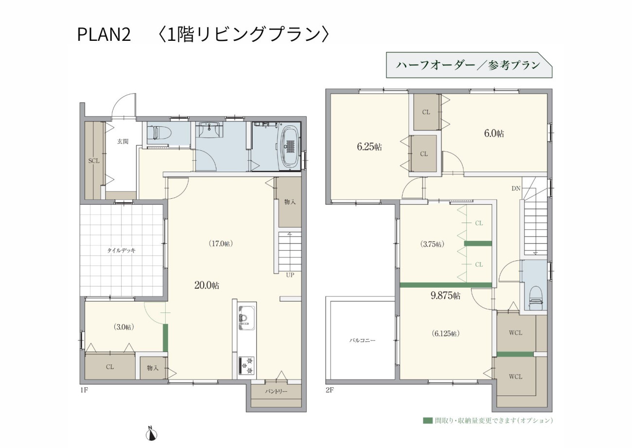 | Atype<PLAN2> | 敷地面積/135.52㎡(40.99坪) 延床面積/113.65㎡(34.38坪) |