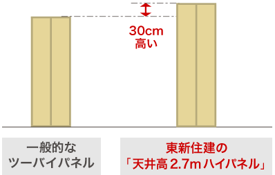 高い天井、ロフトや床下収納も思いのままに変えられるのは間取りだけではありません。通常、部屋の高さは工法によっておよそ決まるものですが、高さ方向の自由度も高めたいと東新住建は考えました。そこで開発したのが、標準的なパネルより30cm長い「天井高2.7mハイパネル」です。これにより、一般的な家より30cm高い2.7mの天井高を実現しました。 天井高2.7mの伸びやかな空間の使い方は、お客様のアイデア次第。高い天井に合わせて大きな窓を開ければ、より明るくて気持ち良いリビング空間が生まれるでしょう。天井の高さを生かしてスキップフロアを設ける、ロフトや床下収納をつくるといった工夫も可能です。 |