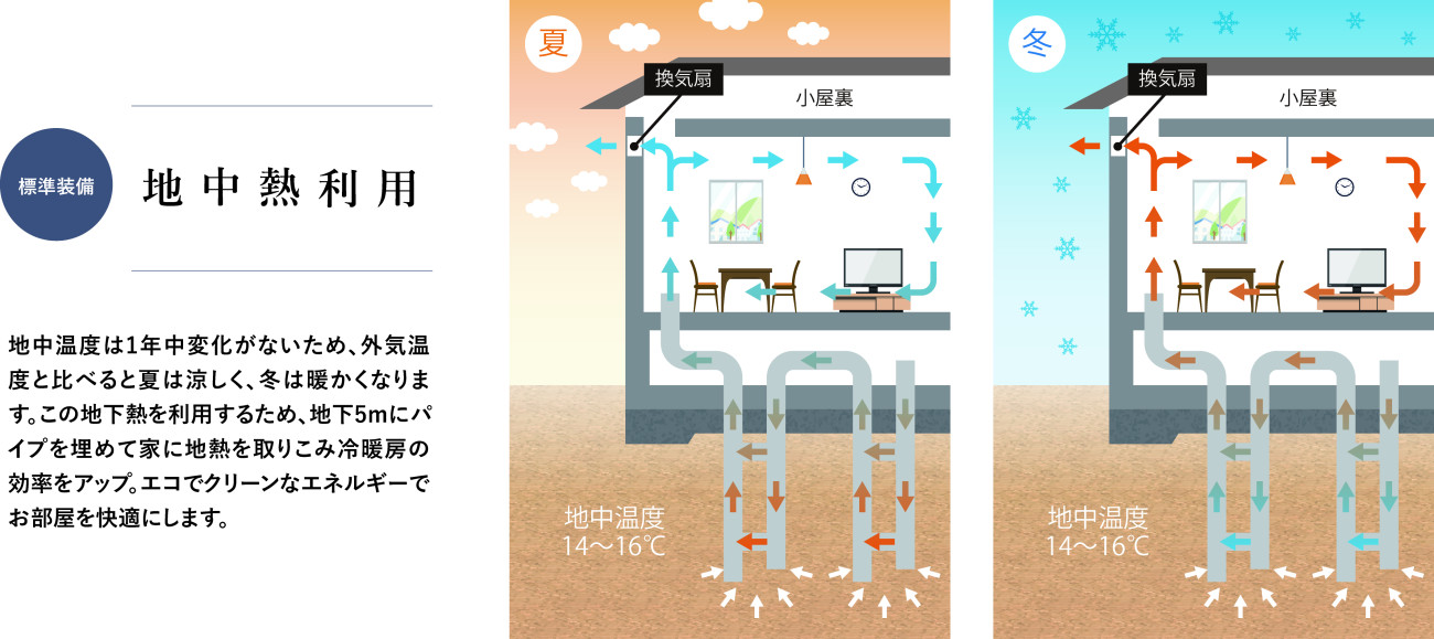 1年中温度変化のない地下熱を家に取り込む事で、夏は涼しく、冬は暖かくなり冷暖房の効率がアップします。