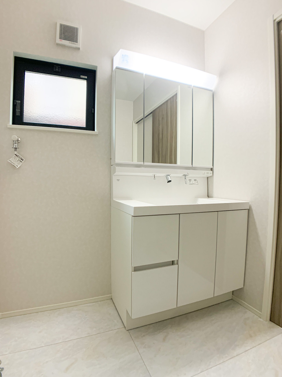 3面鏡裏には、洗面用品の収納に便利な段差を変えられる棚付き