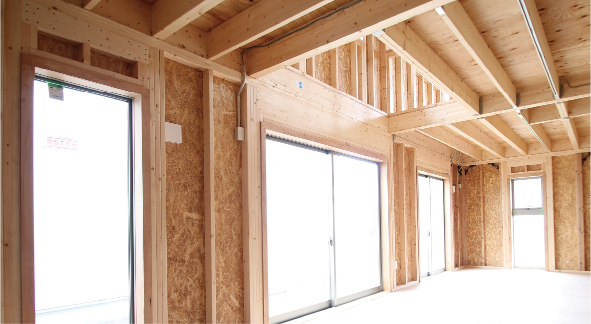 東新住建独自の4.3倍2×4パネルの一部に、国産材を利用しています。元々、2×4工法は北米で発達した工法であるため、輸入材の使用量がほぼ100%となっています。その中に国産材を採り入れる事で、日本の森を守る活動を積極的に行っています。