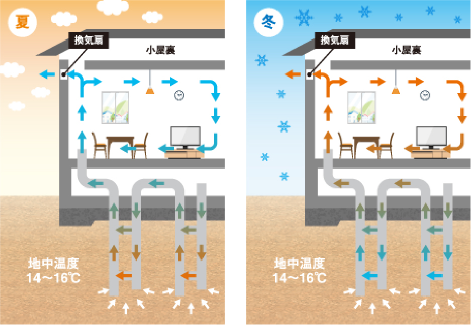 地中温度は1年中変化がないため、外気温度と比べると夏は涼しく、冬は暖かくなります。この地下熱を利用するため、地下5mにパイプを埋めて家に地熱を取りこみ冷暖房の効率をアップ。エコでクリーンなエネルギーでお部屋を快適にします。